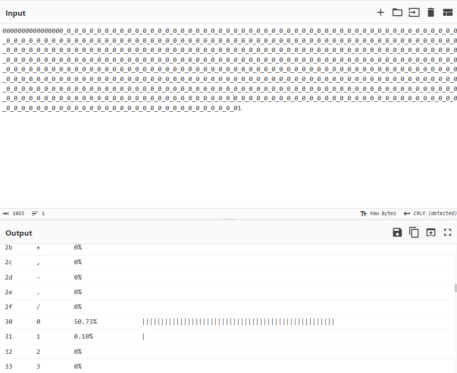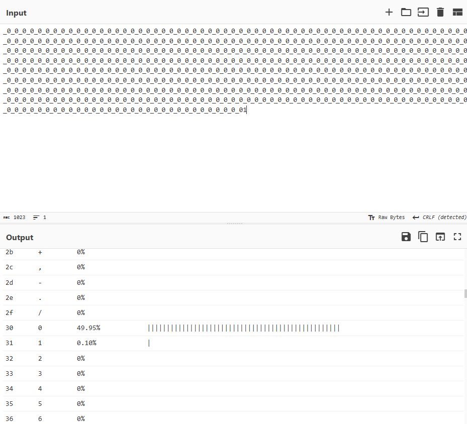 101010101010101010101010101010101010101010101010101010101010101010101010101010101010101010101010101010101010101010101010101010101010101010101010101010101010101010101010101010101010101010101010101010101010101010101010101010101010101010101010101010101010101010101010101010101010101010101010101010101010101010101010101010101010101010101010101010101010101010101010101010101010101010101010101010101010101010101010101010101010101010101010101010101010101010101010101010101010101010101010101010101010101010101010101010101010101010101010101010101010101010101010101010101010101010101010101010101010101010101010101010101010101010101010101010101010101010101010101010101010101010101010101010101010101010101010101010101010101010101010101010101010101010101010101010101010101010101010101010101010101010101010101010101010101010101010101010101010101010101010101010101010101010101010101010101010101010101010101010101010101010101010101010101010101010101010101010101010101010101010101010101010101010101010101010101010101010101010101010101010101所以我们可以知道\(p\)以及\(q\)约半数的位为0,以及最低位为1(因为\(p,q\)必为奇数),所以我们将除了最低位的所有1都替换为下划线后通过Cyberchef统计之后可以看到:
