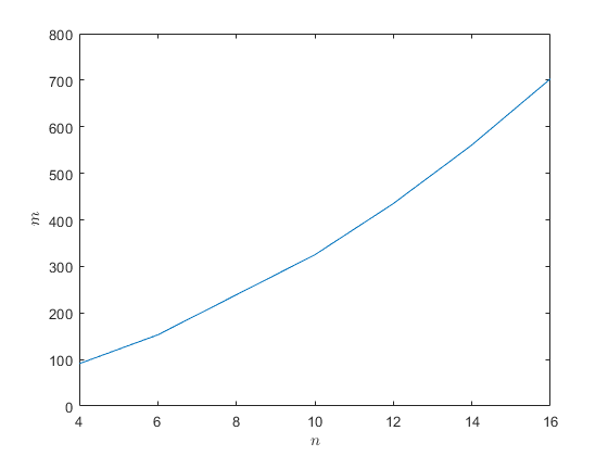 其中\(m\)与\(n\)的关系暂不确定,尝试列出\(n=4, 6,10,12,14,16\)时\(m\)与\(n\)的关系如下:
